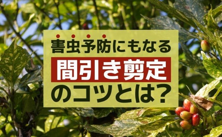 アオキを剪定するときは、「間引き剪定」を基本としています。間引き剪定とは、枝の途中からではなく付け根や株元から切り落とす方法です。間引き剪定をすることにより風通しがよくなるだけでなく樹木の形も整います。