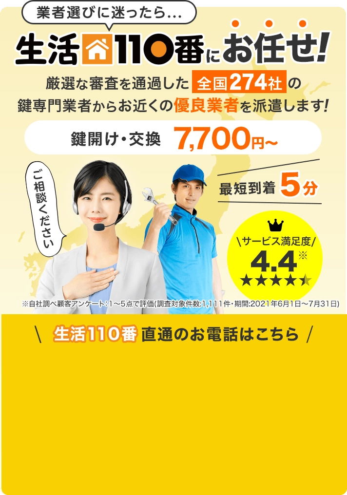 | 料金目安 | 鍵の開錠:7,700円(税込)~ 鍵の交換:13,200円(税込)~ 鍵の修理:7,700円(税込)~ 鍵の作成:8,800円(税込)~ 鍵の新規取付:19,800円(税込)~ |