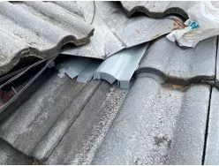 棟板金とはスレート屋根(瓦と違い、まっすぐな板を使用した屋根)の頂点の部分にかぶせる山形状の金属板のことです。壊れていたりクギがゆるんで浮いていたりしたら、そこから雨漏りが発生します。