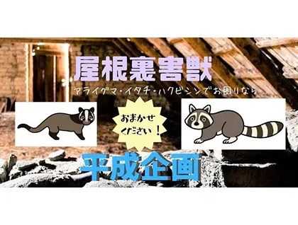 植原害獣駆除を承っております、平成企画です。例え、動物好きな方であっても、野生動物の不衛生さ・糞尿の悪臭などを無視して生活することはできないでしょう。当社は害獣の被害で苦しんでいる皆様をいち早くお助けすることに尽力しております。再び被害に遭わないための対策もきちんと施しますので、安心して当社にお任せいただけると幸いです。
