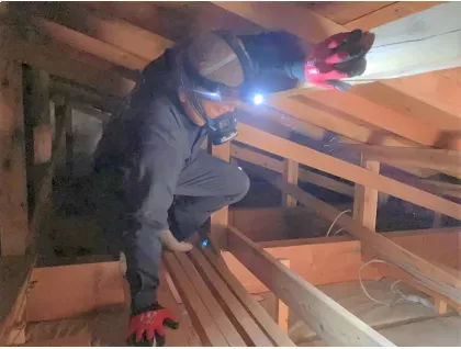 コウモリが潜む場所は、壁の中や天井内部など普段は目につかない場所が多いです。そのため、調査時にはお写真を撮り、状況をお見せしながら説明やご提案をしています。