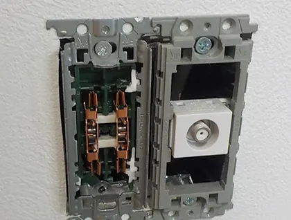 コンセントが壊れたので取り換えてほしいとお客様からご依頼がありました。 コンセントを自分で外そうとしてショートしたようです。子供のいる部屋で、コンセントも壊れており中の金属が出ている危険な状態でした。 取り急ぎコンセントを新しいものに取り替え、電源を入れ終わりました。 施工内容としては、壊れたコンセントを取り外す→新しいものを取り付ける→ブレーカーを入れる→電圧確認をして終了です。 コンセントの種類やプレートが事前に聞いていた話と違う部分がありましたが、すぐに手配して修繕できました。