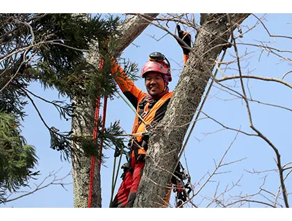 当店のスタッフはロープ高所作業者の教育のほか、IRATAとよばれるロープアクセスの国際資格を活かし、重機の入れない場所での特殊伐採を承っています。「ほかで作業を断られた」といった伐採工事は当店にご相談ください。見積もりをし、最適なプランをご提案します。