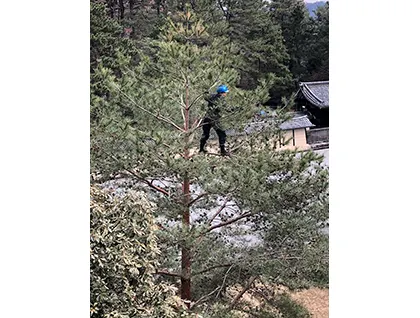 住宅地など重機の入れない場所では、ロープワークといって縄を使って木に登る技術で剪定をおこないます。高木の剪定ができる業者をお探しのときには当店にお任せを!